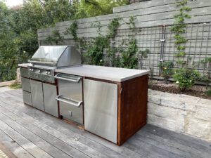Honed New Mexico Buff outdoor fireplace and kitchen