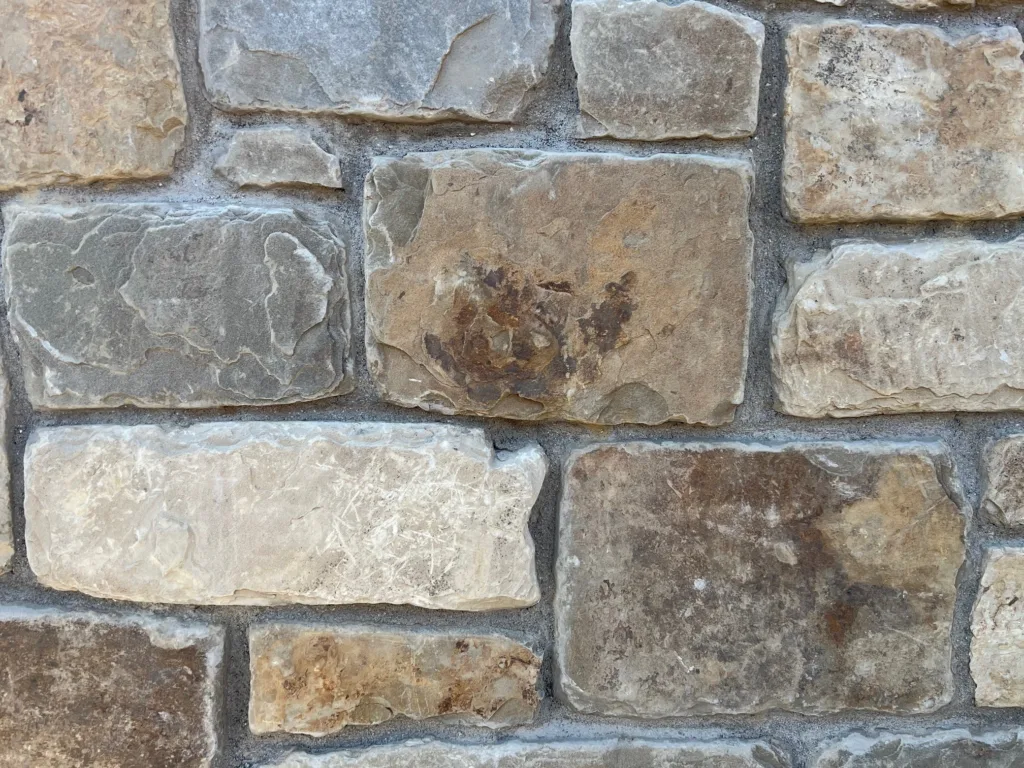 This 3-course ashlar is made of a quartzite stone with tumbled edges.